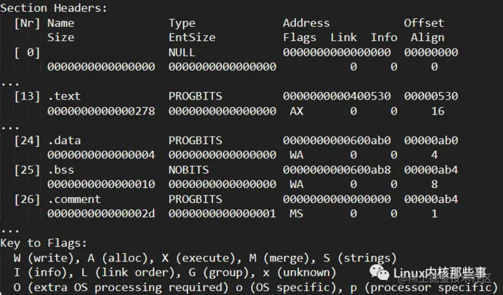 我们可以通过 readelf -S file 命令来查看 ELF 文件的段(节)信息,如下图所示: