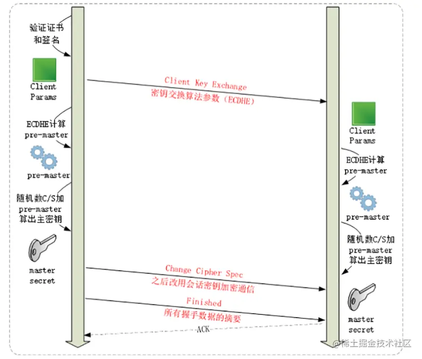 - 客户端和服务端拿着共有的 client params 和 server params,利用 ECDHE 算法计算出 预备主密钥(pre-master secret)