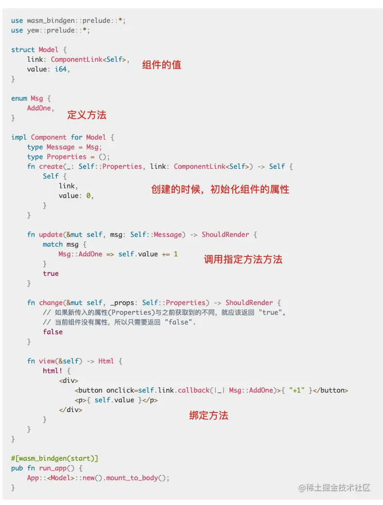看完了实例测试,我们不能略过测试中提到的 Rust。Rust 中有个类似于 react 的框架,叫做Yew。关于 Yew 官方[github.com/yewstack/ye…