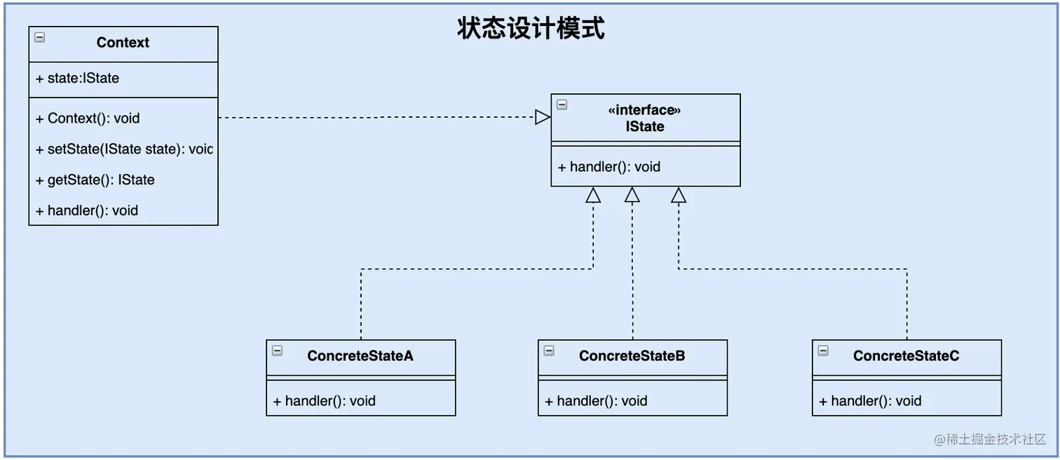 状态模式可以很好地解决这个问题。 状态模式的思想:当是条件语句表示一个对象状态转换过于复杂时,可以把条件判断中的“判断逻辑”提取出来,放在单独的类中,当前上下文处于那种状态,直接用相应的状态类对象进行处理,这样的好处是:能把原来复杂的判断逻辑简单化,消除了 if-else、switch-case 等条件判断语句,代码更有层次性,且具备良好的扩展力, 可维护性。