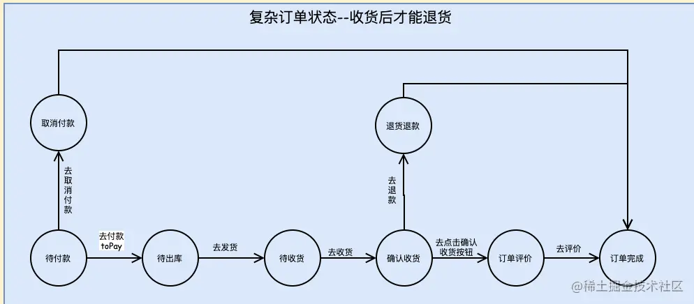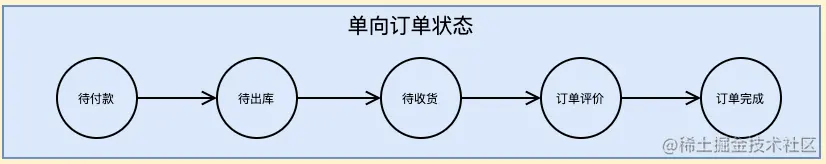 在电商系统购物的过程中,订单一般有这几种状态,待付款,待出库,待收货, 待评价,完成。不同的状态下,用户看到的行为是不同的。