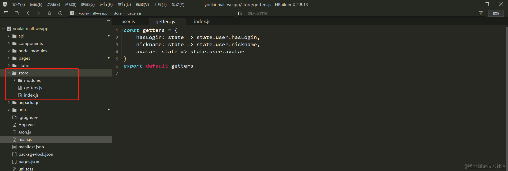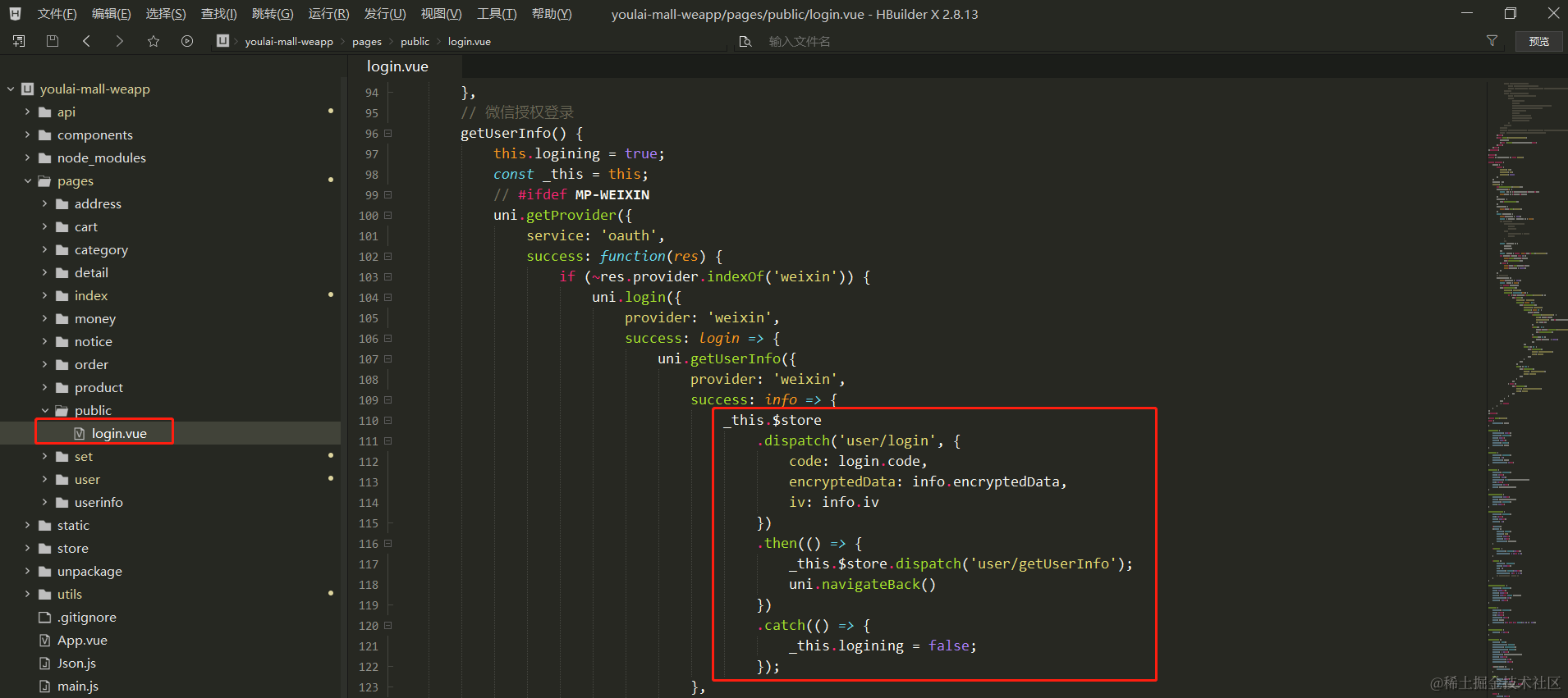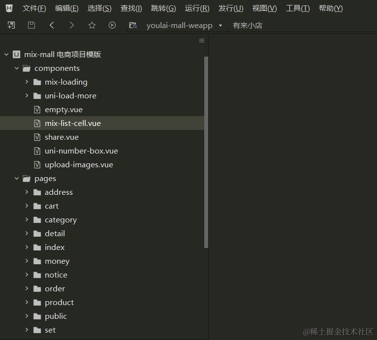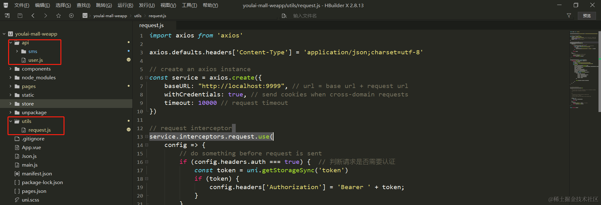 导入的商城模板默认的是本地JSON数据,那么接入后台微服务需要封装axios请求,此外还需添加vuex来对状态进行管理,这两项引自vue-element-admin,细节请参考源码 youlai-mall-weapp,微信小程序调整步骤如下: