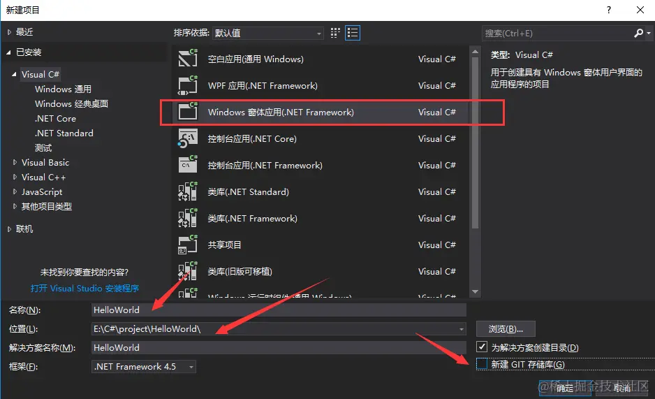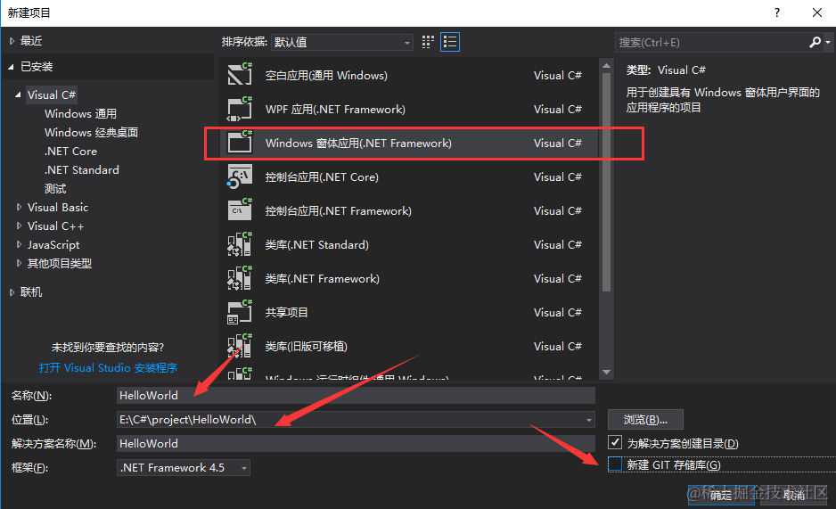 首先选择新建Windows窗体应用(.NET Framework),然后选择项目保存位置,填写项目名称,这里因为我们不需要用git进行版本管理,所以不用新建GIT存储库;