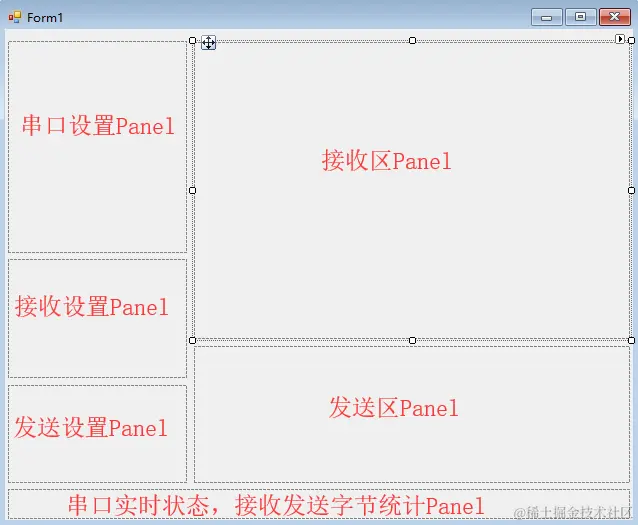 根据以上功能,将整个界面分为两块:设置界面(不可缩放)+ 接收区和发送区(可缩放),下面就来依次拖放控件实现: