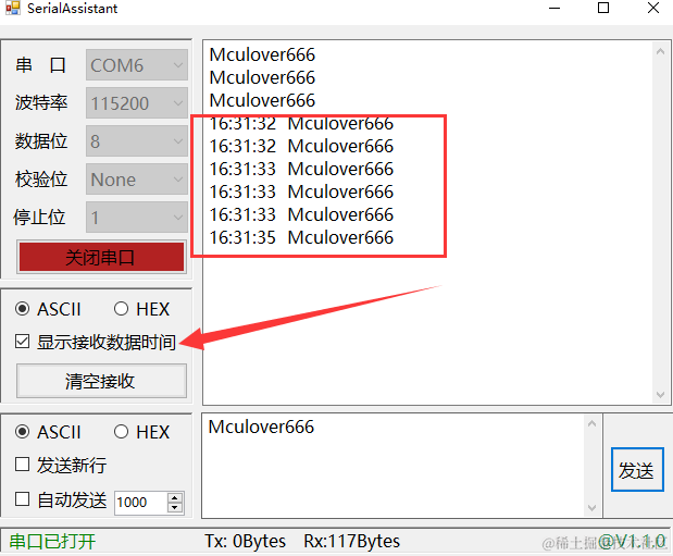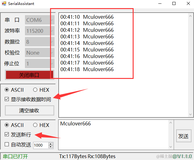 再来运行看一下最终效果(先发送“Mculover66”加回车,然后发送“1”加回车):