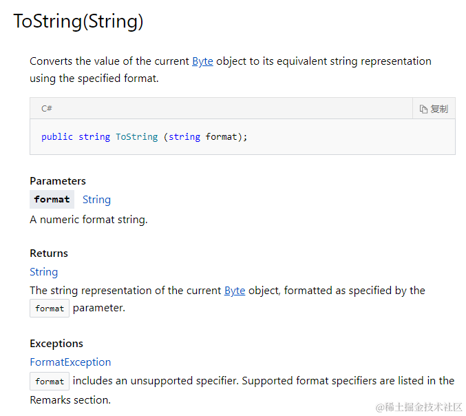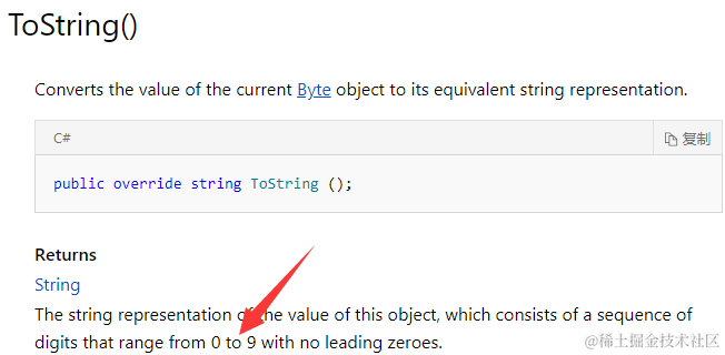 可以看到,当我们发送字符“1”的时候,状态栏显示接收到1byte数据,表明计数正常,但是接收到的却是字符形式的“49”,这是因为接收到的byte类型的数据存放的就是ASCII码值,而调用byte对象的ToString()方法,由下图可看到,这个方法刚好又将这个ASCII值49转化成为了字符串“49”,而不是对应的ASCII字符'1';