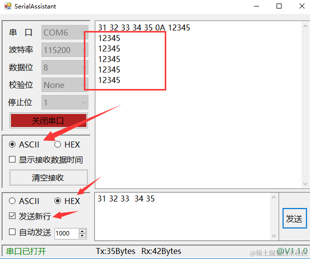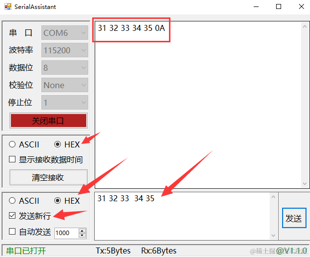然后是发送部分,与之前对应,调试过程中还需要直接发送十六进制数据,所以也需要添加两个单选框来选择发送ASCII码还是HEX码;除了这个功能,还需要添加自动发送的功能,自动发送新行功能方便调试;