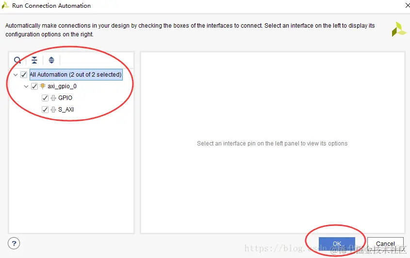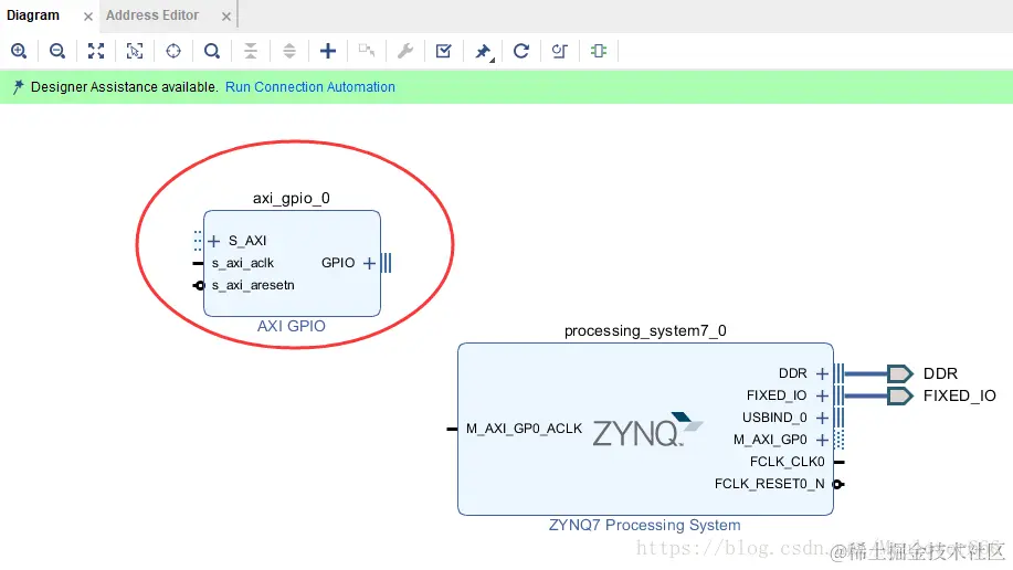 然后同样的,点击“Run Connection Automation”,自动完成ZynqPS核和AXI GPIO核之间的连接: