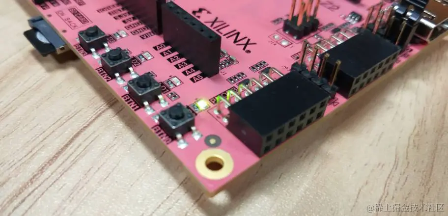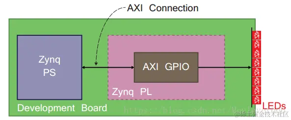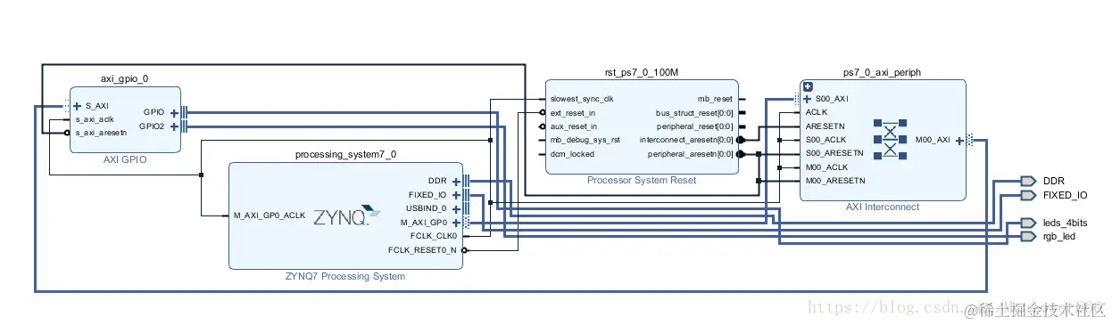 完成了整个实验后再来看这张图,首先在PL端通过添加AXI GPIO IP核实现一个GPIO控制器,GPIO控制器由于在PL端,所以输出直接与4个板载LED相连,然后vivado自动布局布线,将GPIO控制器的受控端与PS端处理器核进行对应连接,然后生成导出硬件设计文件供SDK使用。