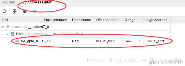 点击右侧Address Editor即可看到硬件相关信息,在PL端实现的axi_gpio_0 IP核中所包含的寄存器首地址和结束地址,这个信息待会就要导出到硬件设计文件中,通过软件操作相关寄存器。