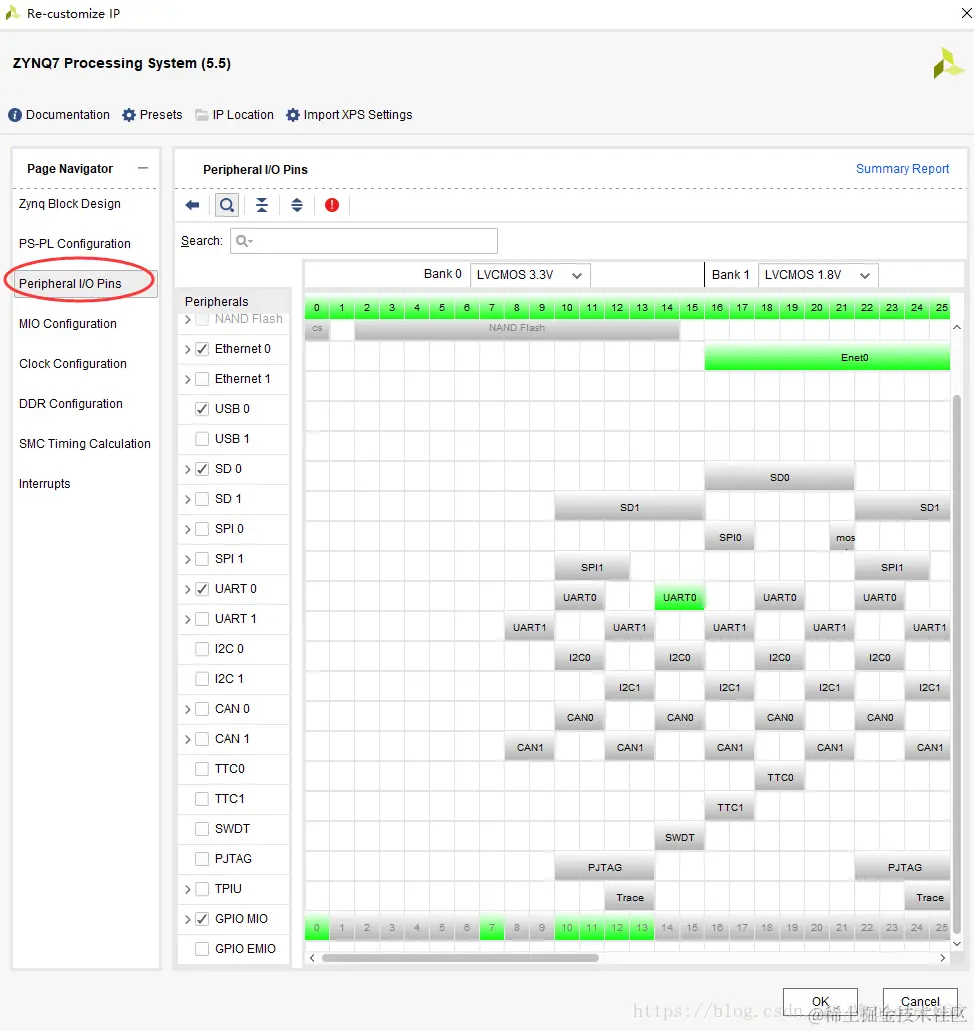 这个时候双击ip核打开设置可以看到都已经自动完成了,其中“Peripheral I/O Pins”是指定PS端I/O外设引脚,此处我们暂且不作修改:
