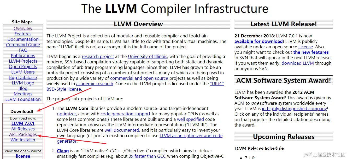 - 首先去LLVM官网,我们使用添加软件源在线安装的方法,点击左侧边栏中最新版本下载链接中的APT Packages(最低是LLVM 7.0.0):