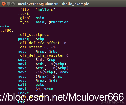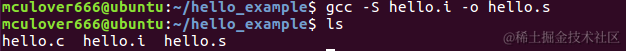 使用gcc -S 预处理后的文件对预处理后的文件进行编译,并生成汇编文件hello.s,-S参数表示只进行编译而不进行汇编,只生成汇编文件,所以使用命令:gcc -S hello.i -o hello.s