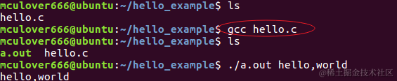 我们再来粗暴一点,直接使用默认文件名a.out好了:gcc <源文件>,此处使用命令gcc hello.c: