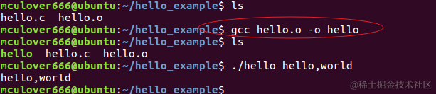 -链接所有的目标文件,生成可执行程序gcc <目标文件名> -o <可执行程序名>,此处使用命令gcc hello.o -o hello: