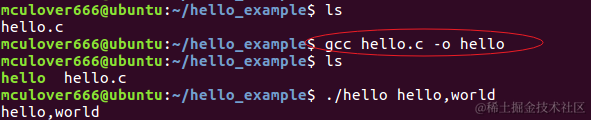 可以看到这两步就可以完成之前的工作,甚至,我们还可以一行搞定:gcc <源文件名> -o <可执行程序名>,此处使用命令gcc hello.c -o hello: