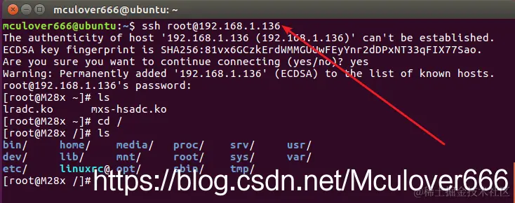 使用之前的串口终端minicom登入到开发板,开发板的ip固定为192.168.1.136(后续会讲如何固定):