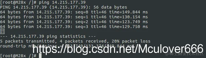 尝试访问一下百度,这个时候因为开发板没有配置DNS解析,所以使用百度的ip地址(14.215.177.39):