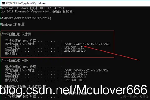 使用win+r,输入cmd,打开命令行,输入ipconfig查看是否设置正确: