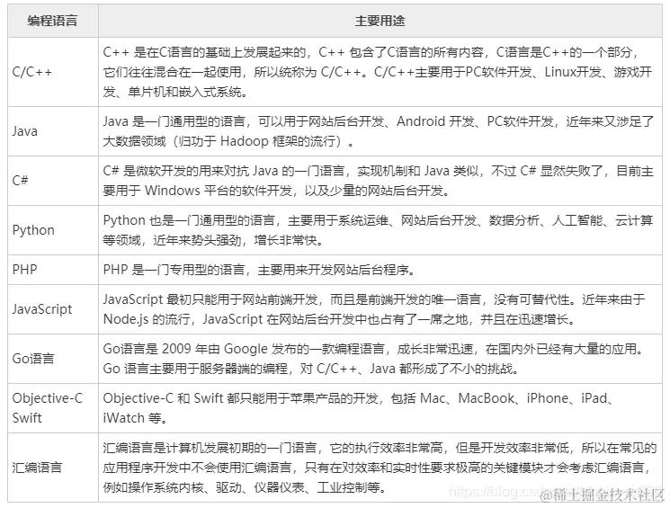 每种编程语言都有自己擅长的方面,选择自己需要的就好,甚至还有图形化的编程语言 ——Scratch,下面这一张表可以简单的介绍一下这些编程语言: