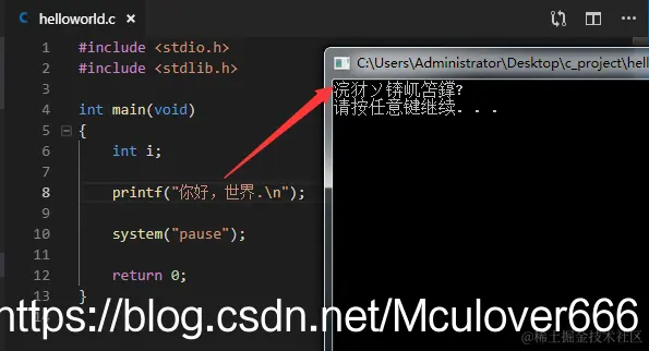 在VS Code编写C语言时,经常会遇到中文显示乱码问题,如下: