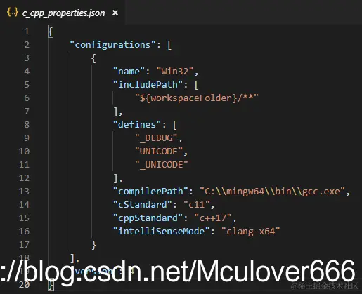 cStandard和cppStandard用于选择编译器使用的C/C++语言标准,这里我们使用最新的c11;intelliSenseMode是IntelliSense功能的设置,这里我们设置为gcc-x64,有助于IntelliSense功能根据编译器所在的路径来自动推断C/C++标准库头文件的路径,以提供正确的路径;