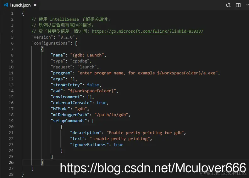 program中的最后需要指定可执行程序的名称;stopAtEntry是启动调试时自动停止在程序入口第一行main,可设置为true或false;miDebuggerPath中需要指定gdb调试器的路径,比如在这个我指定为C:/mingw64/bin/gdb.exe;