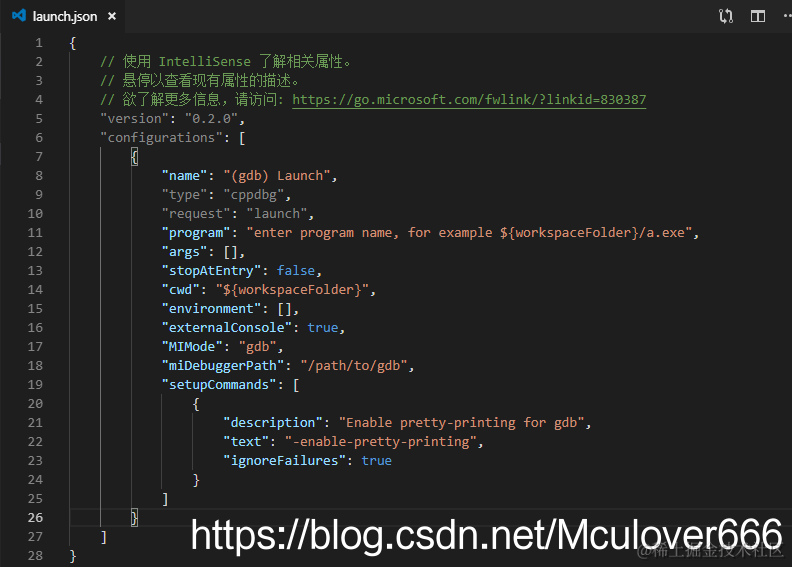 .vscode下生成launch.json文件,该文件指定了调试器的设置,其默认内容如下: