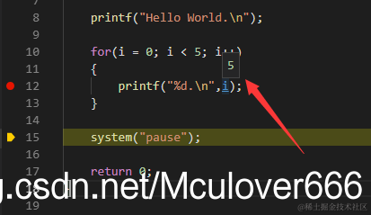 然后使用单步调试运行进行调试,在程序暂停时,可以将鼠标悬停在变量处查看该变量这个时刻的值:
