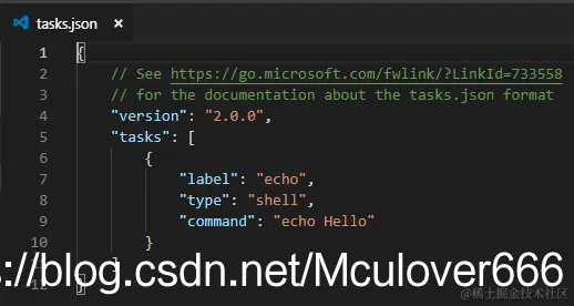 .vscode文件夹创建tasks.json文件,该文件指定如何构建可执行文件,其默认内容如下: