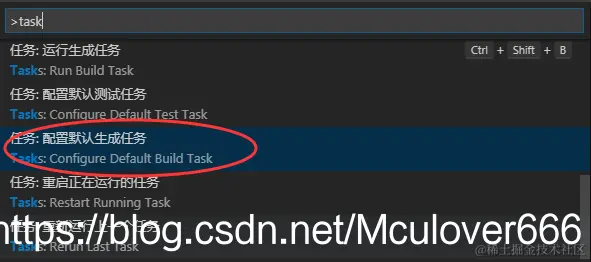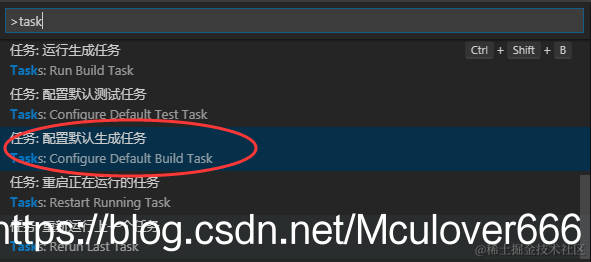 Ctrl+Shift+P调出命令面板,输入task,选择Tasks:Configure Default Build Task: