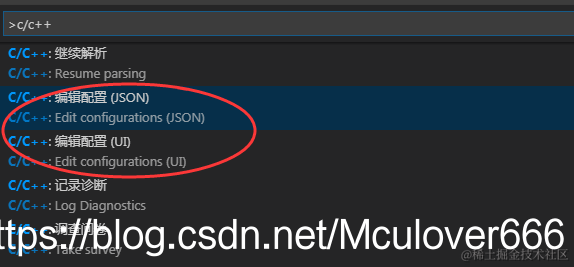 Ctrl+Shift+P打开命令面板,输入C/C++,推荐列表中有UI方式和JSON格式的两种编辑配置方式,如图(这里我们选择Edit configurations(JSON)):