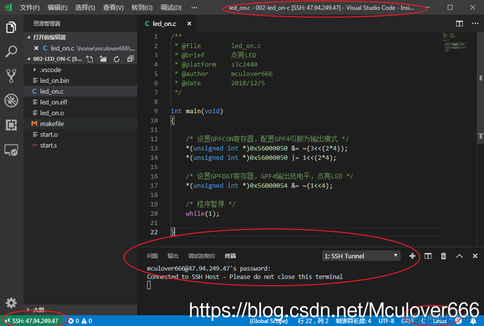 - 使用SSH远程终端,在服务器上编译出可执行文件;