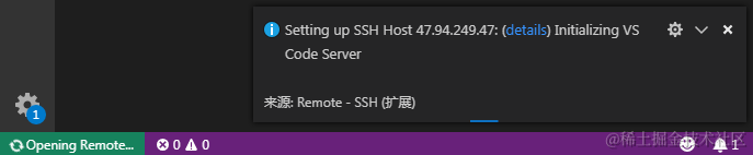 首次登录后,VS Code会自动弹出一个新的窗口用于远程工作,并且会自动在远程主机上安装VS Code server: