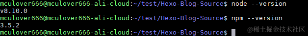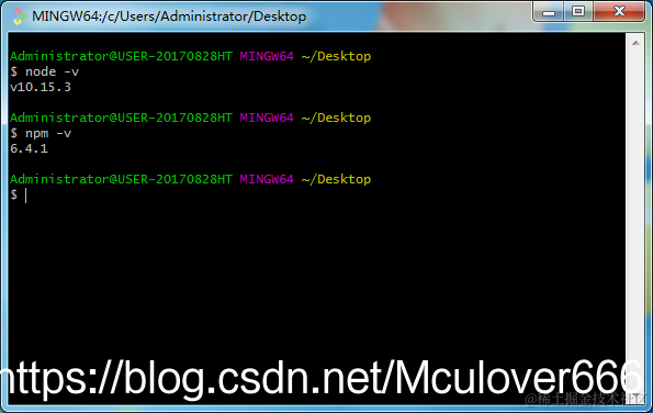 Hexo的很多操作需要在命令行完成,所以使用Git自带的Git Bash作为命令行,比较好用,查看Node.js是否安装成功: