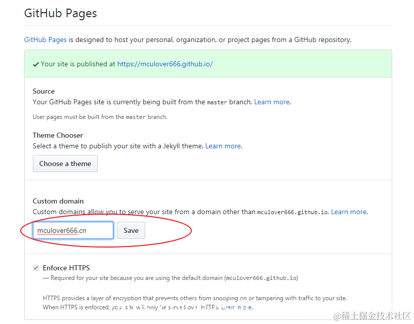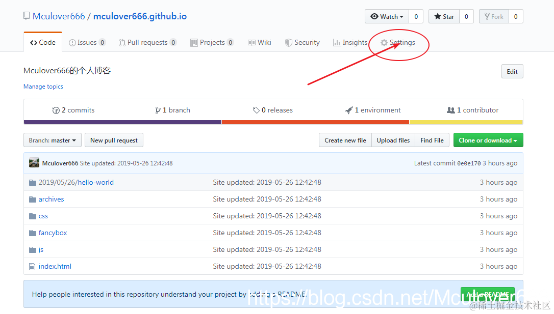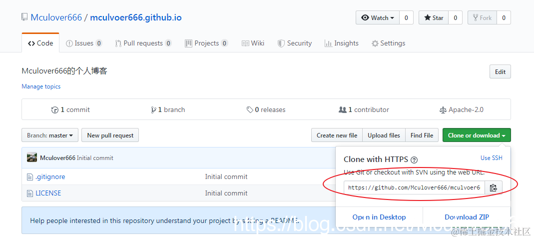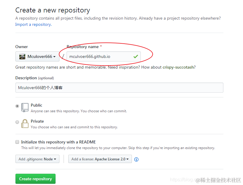在Github上创建一个新的仓库,在填写地址的时候注意,这个地址是就是你的域名,以github.io结尾,我这里注册的是mculover666.github.io: