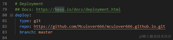 然后打开站点配置文件_config.yml,在最后修改deploy的值: