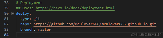 在首次部署之前必须设置type字段,该字段表明了使用的部署工具,比如git,后续repo字段表明了仓库地址,branch字段表明了仓库的分支,如图: