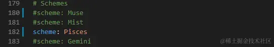 在主题配置文件,搜索 scheme 关键字,有三行 scheme 的配置,将需用启用的 scheme 前面注释符 # 去除即可: