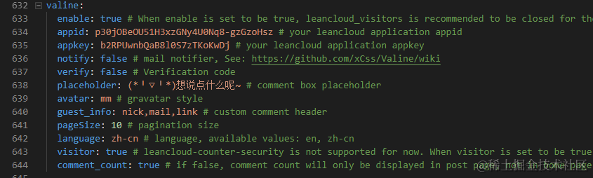 打开主题配置文件搜索 valine,填入appid 和 appkey: