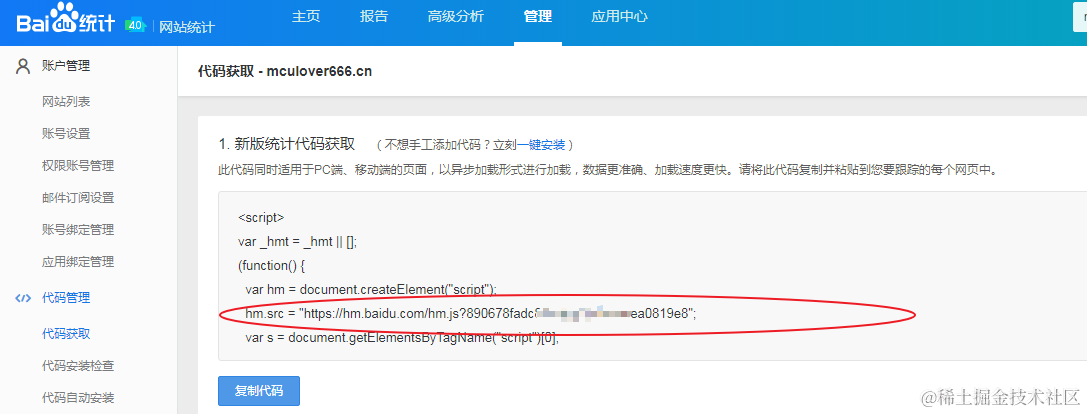 访问百度统计网站并登录,添加需要统计的域名,定位到站点的代码获取页面。