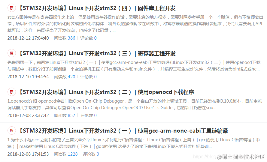 直到上学期学校开设了Linux课程,我才得以系统的学习了Linux基础命令,C语言的编译链接过程,gcc和gdb工具的使用,makefile的编写,另外一方面,由于一直使用stm32做项目,对stm32也比较熟悉,之后我再次折腾了一下,花了不到一个小时的时间就配置好了,很有成就感,整个过程写了博客,公众号,在野火论坛也发帖分享。
