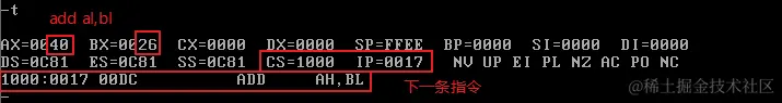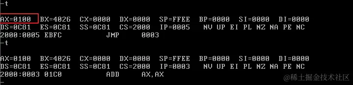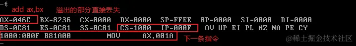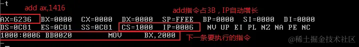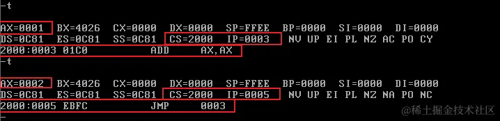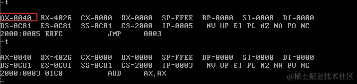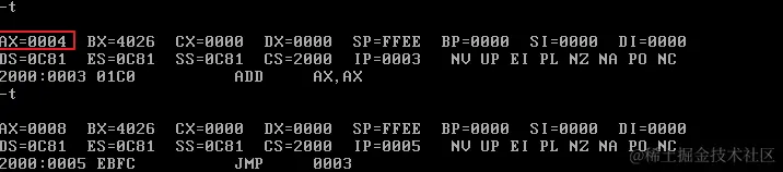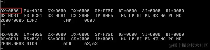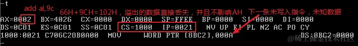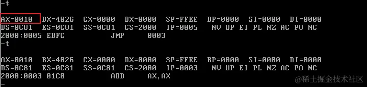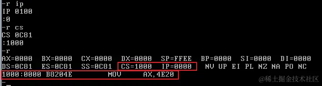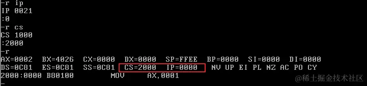 首先修改CS和IP的值,指向程序起始处(2000:0),准备执行程序:
