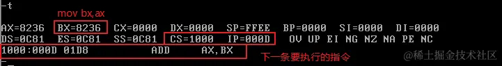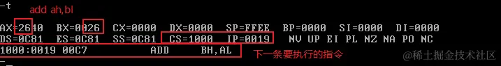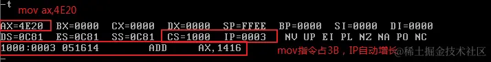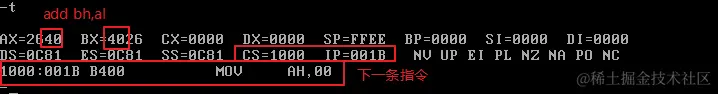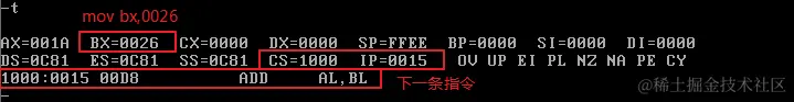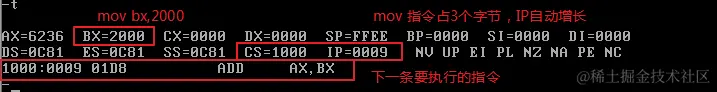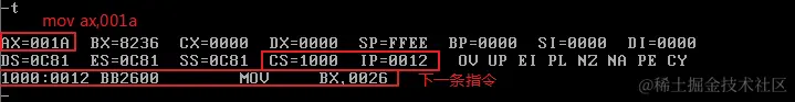使用Debug,将下面的程序段写入内存,逐条执行,观察每条指令执行后CPU中相关寄存器中内容的变化。
