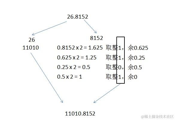 - 小数部分:乘2取整,直至小数部分为零,取出的整数正序排列(如不为零,则按要求保留足够位数的小数,最后一位0舍1入)