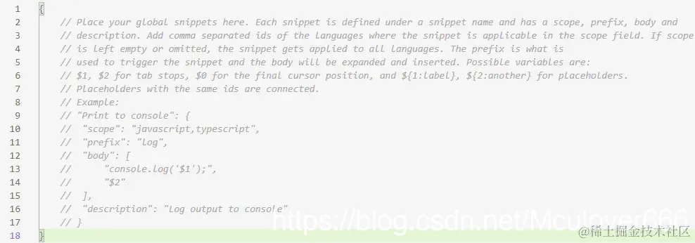 默认内容为空,注释中给出了基本的代码片段格式,可以看到要以json格式编写: