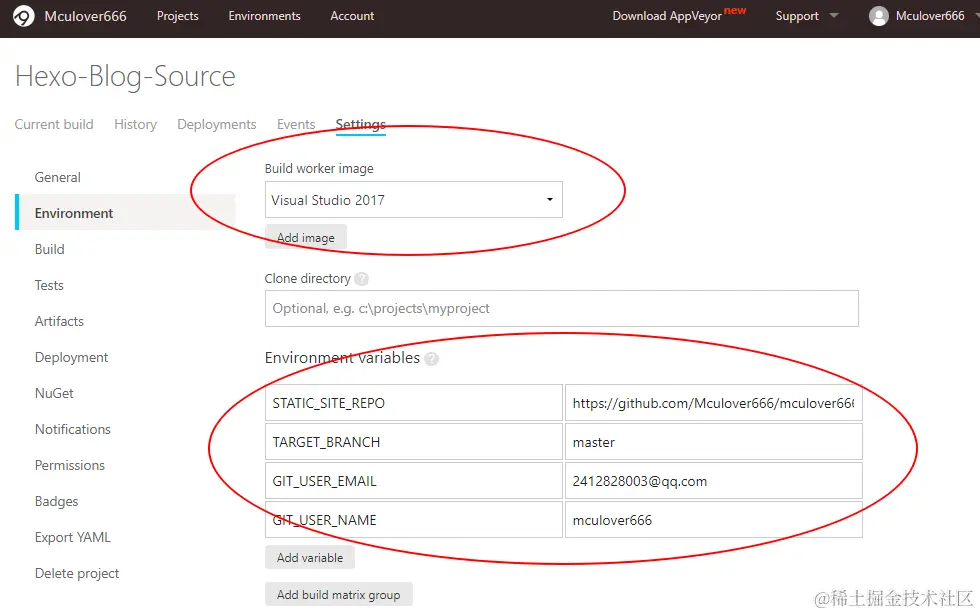 添加好appveyor.yml之后,再到Appveyor portal添加以下四个变量: