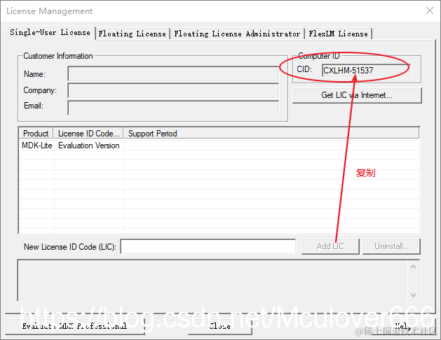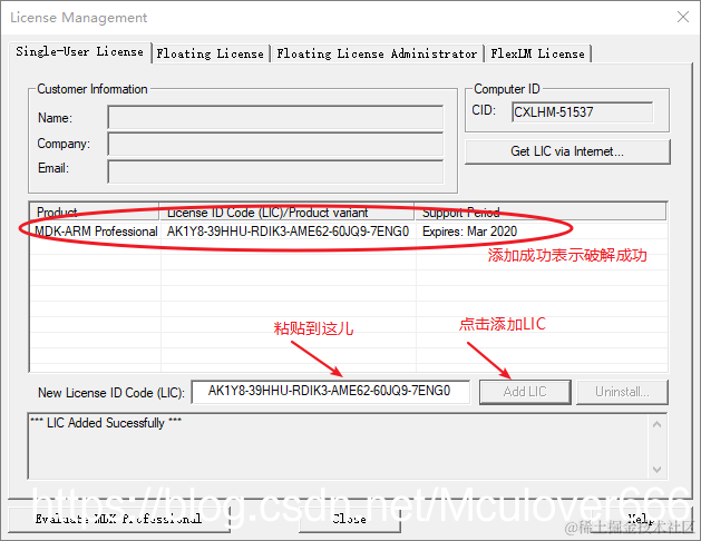 将生成的激活码复制,粘贴到keil里,添加LIC: