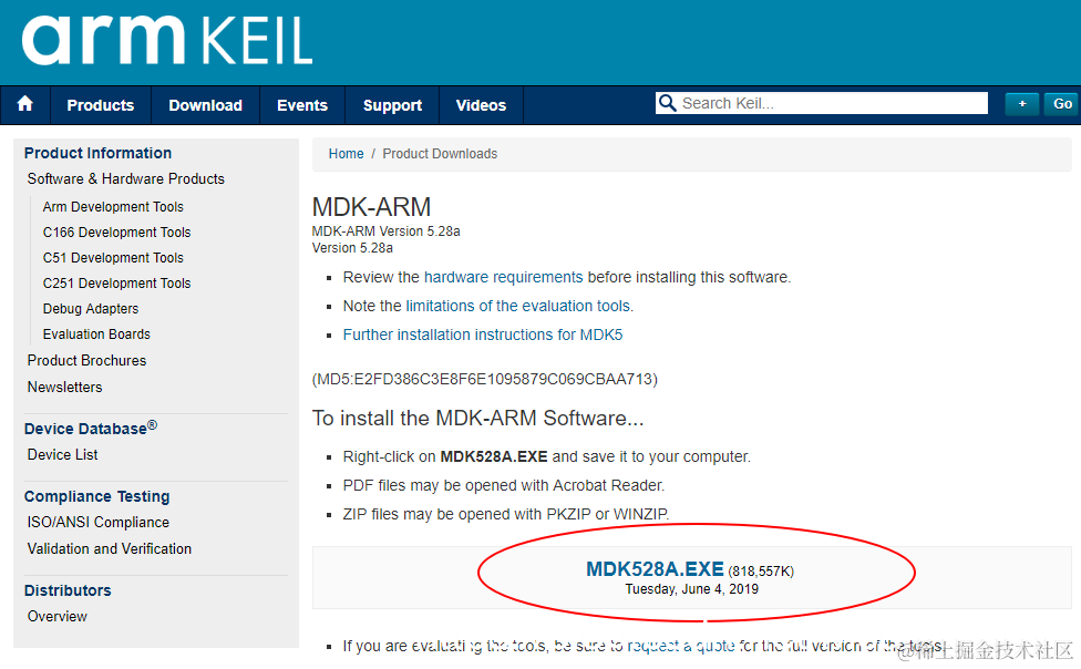 Keil MDK的安装包可以从官方网站获取,最新版为5.28:传送门。