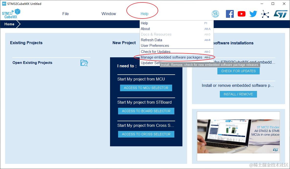 打开STM32CubeMX,选择Help->Manage embedded software packages: